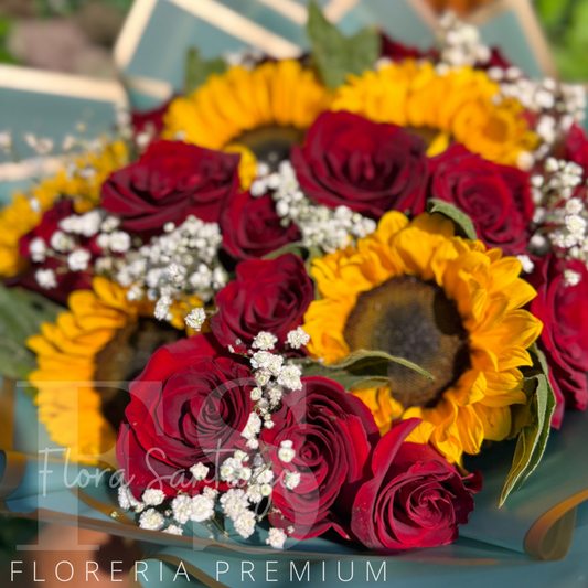 Ramos de 15 rosas rojas y 6 girasoles envuelto en papel coreano, envía flores a domicilio