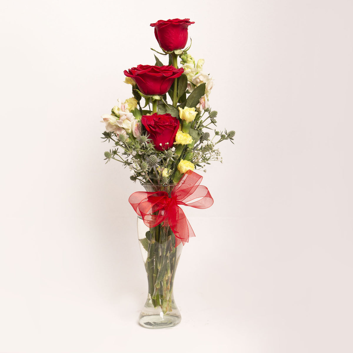 Este hermoso florero contiene un ramo de tres rosas frescas, ideales para sorprender y expresar amor o gratitud. Las rosas están dispuestas en un elegante florero, lo que las hace perfectas para decorar cualquier espacio y brindar un toque de color y aroma. ¡Un regalo perfecto para cualquier ocasión!