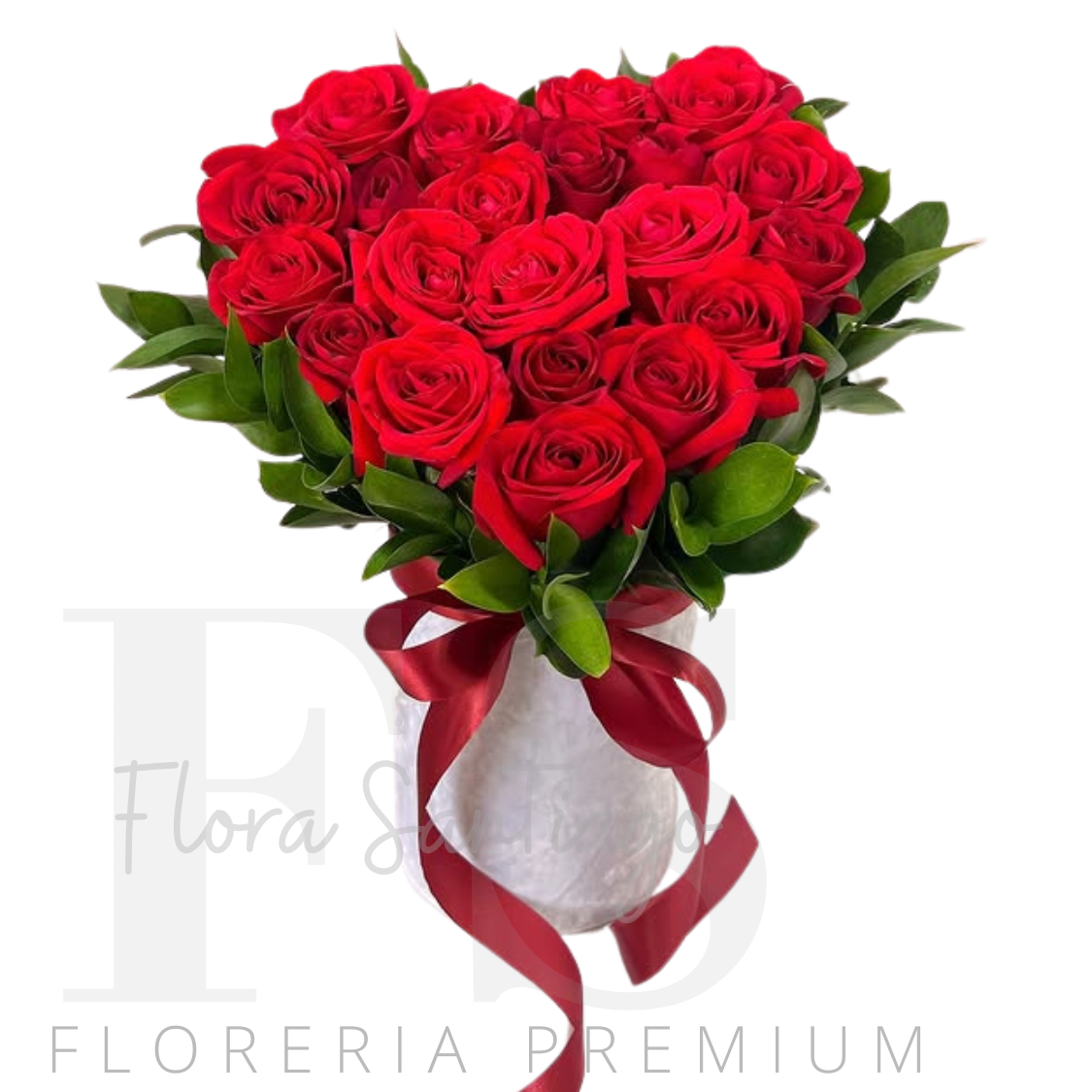 Hermoso arreglo en box de 20 rosas rojas denso forma a un lindo corazón altura 50 cm