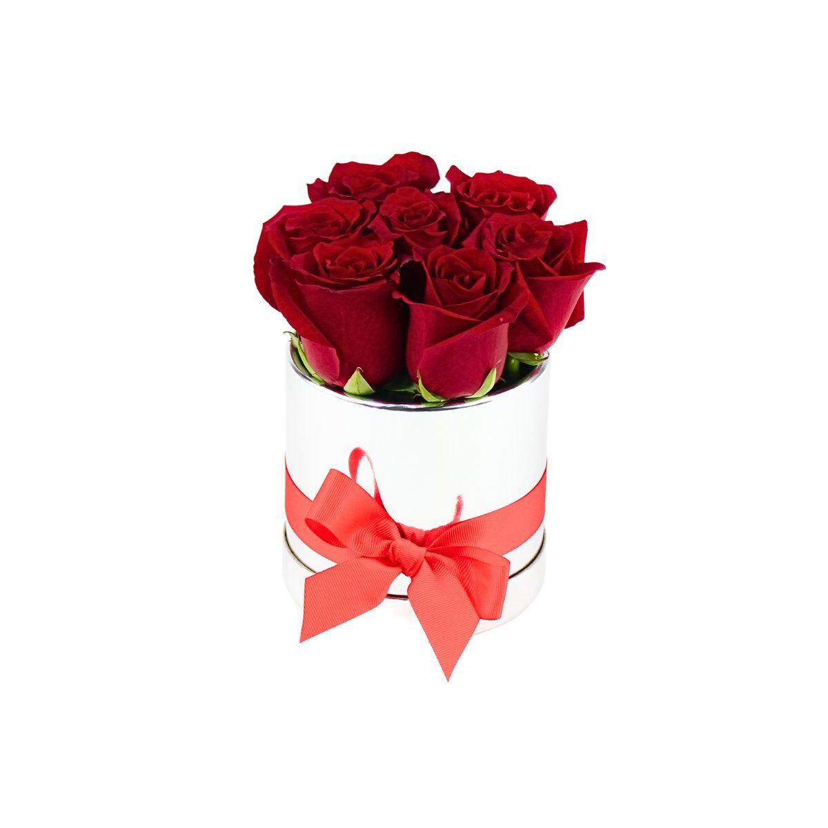 Arreglo box cilíndrico blanco, con seis rosas rojas