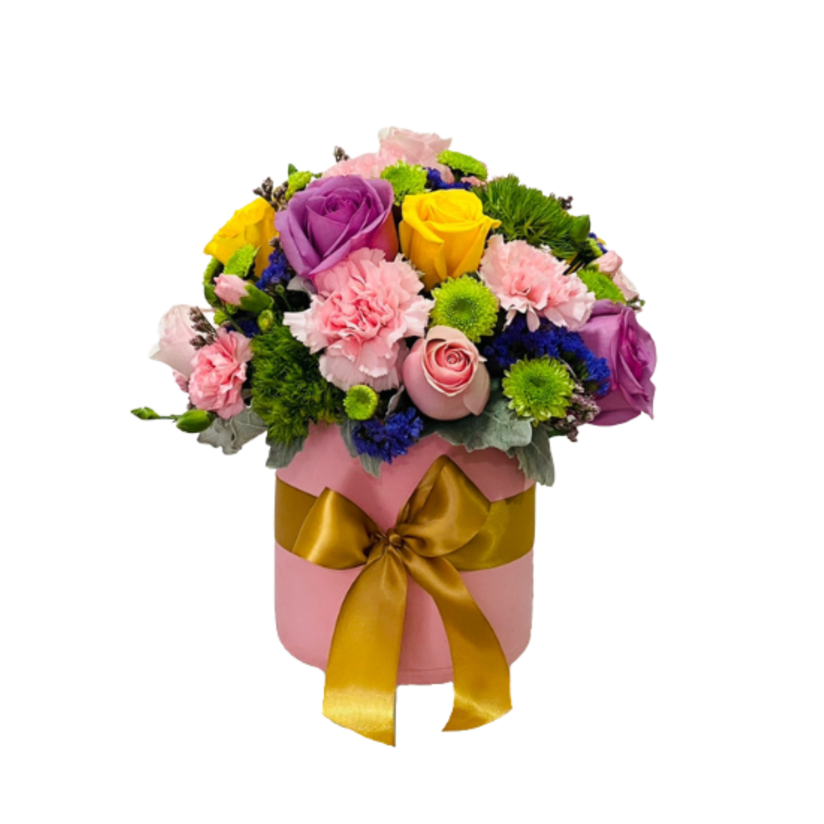 Este elegante box de flores surtidas combina la belleza de rosas de colores vibrantes, claveles delicados y un fresco follaje que realza cada detalle. Perfecto para expresar sentimientos con un toque sofisticado, este arreglo ofrece una armonía visual y aroma que cautivan en cualquier ocasión especial. Ideal para regalar o decorar, garantiza frescura y estilo en cada presentación.
