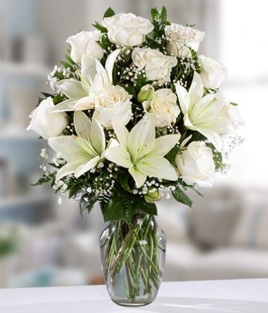 hermoso florero de 10 Liliums blanco y 10 rosas blancas