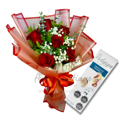 Este ramo de 6 rosas rojas, complementado con bombones belgas, ofrece una presentación elegante y significativa. Las rosas rojas simbolizan amor y aprecio, mientras que los bombones de alta calidad proporcionan una experiencia gustativa placentera. Ideal para ocasiones especiales o como un gesto de cariño.