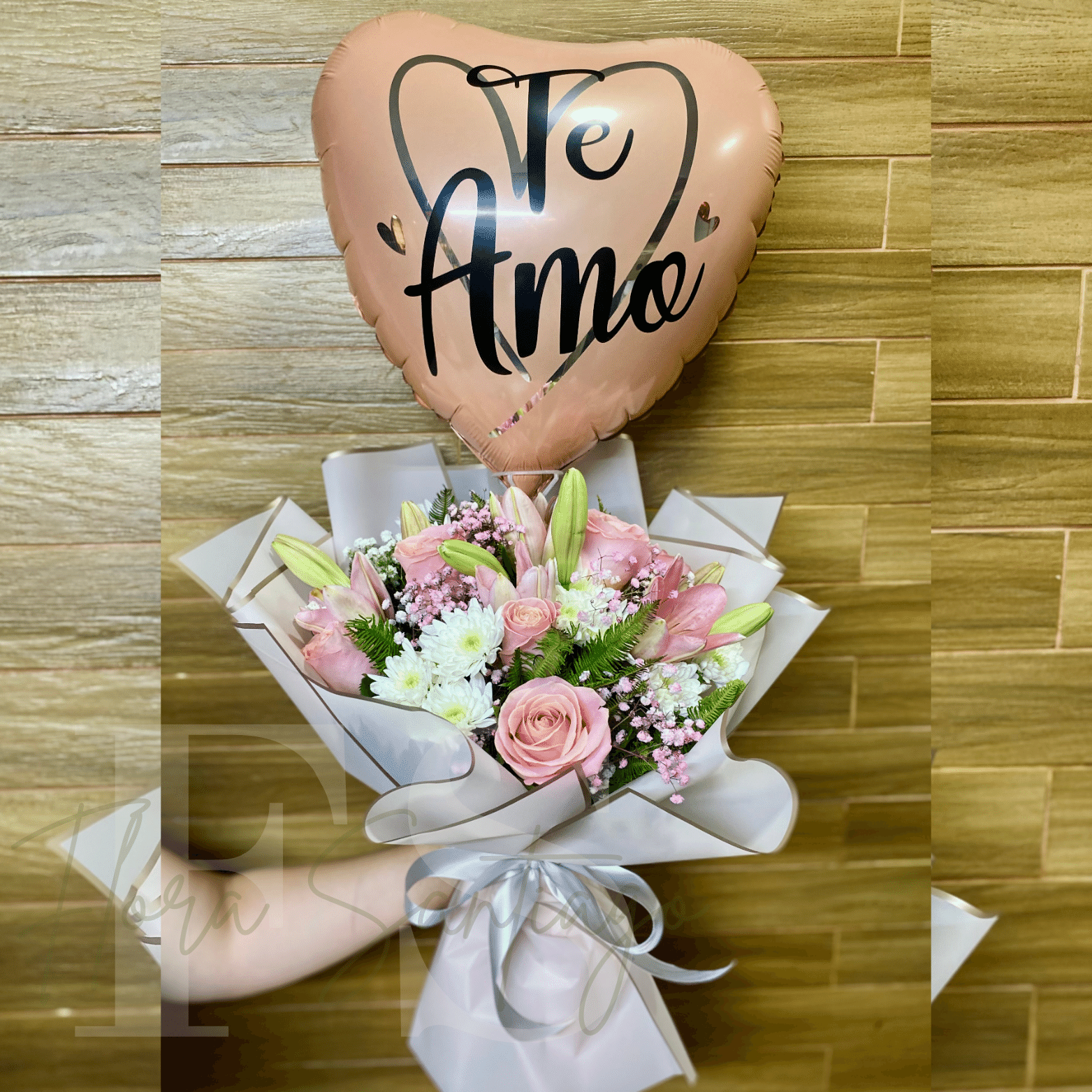 "Deleita los sentidos con nuestro elegante ramo, una sinfonía de flores en tonos pastel que danzan en perfecta armonía. Este regalo se eleva a nuevas alturas con un lindo globo metálico grande, añadiendo un toque de alegría y diversión. La combinación de la suavidad de las flores y el brillo del globo crea una experiencia visual encantadora y memorable. Celebra momentos especiales con este regalo que fusiona la elegancia floral con la ligereza juguetona del globo."