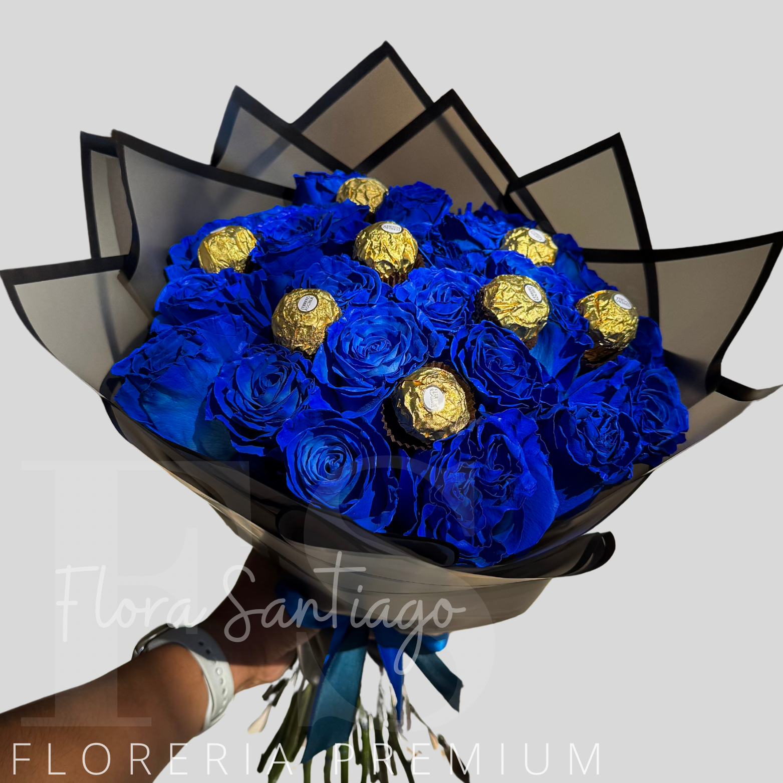 Ramo de 24 rosas azules y 8 bombones de chocolate Ferrero Rocher