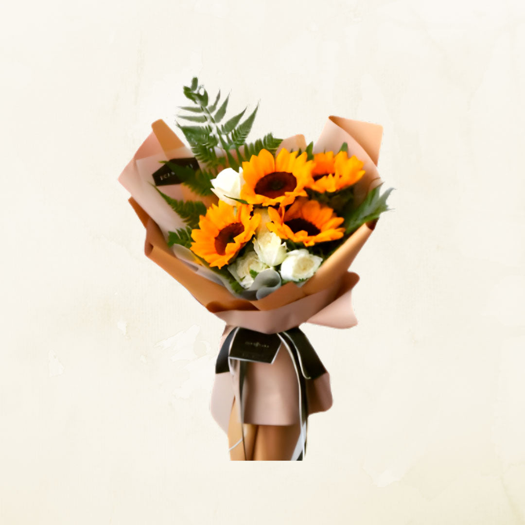 Ramo elegante que combina la calidez de cuatro girasoles amarillos con la pureza de cuatro rosas blancas. Esta composición floral equilibrada es ideal para expresar alegría, admiración y sentimientos sinceros en cualquier ocasión especial. Los girasoles aportan vitalidad y optimismo, mientras que las rosas blancas simbolizan elegancia y respeto. Perfecto para cumpleaños, aniversarios, agradecimientos o simplemente para iluminar el día de alguien especial. Cada tallo seleccionado cuidadosamente para garantizar frescura y durabilidad.