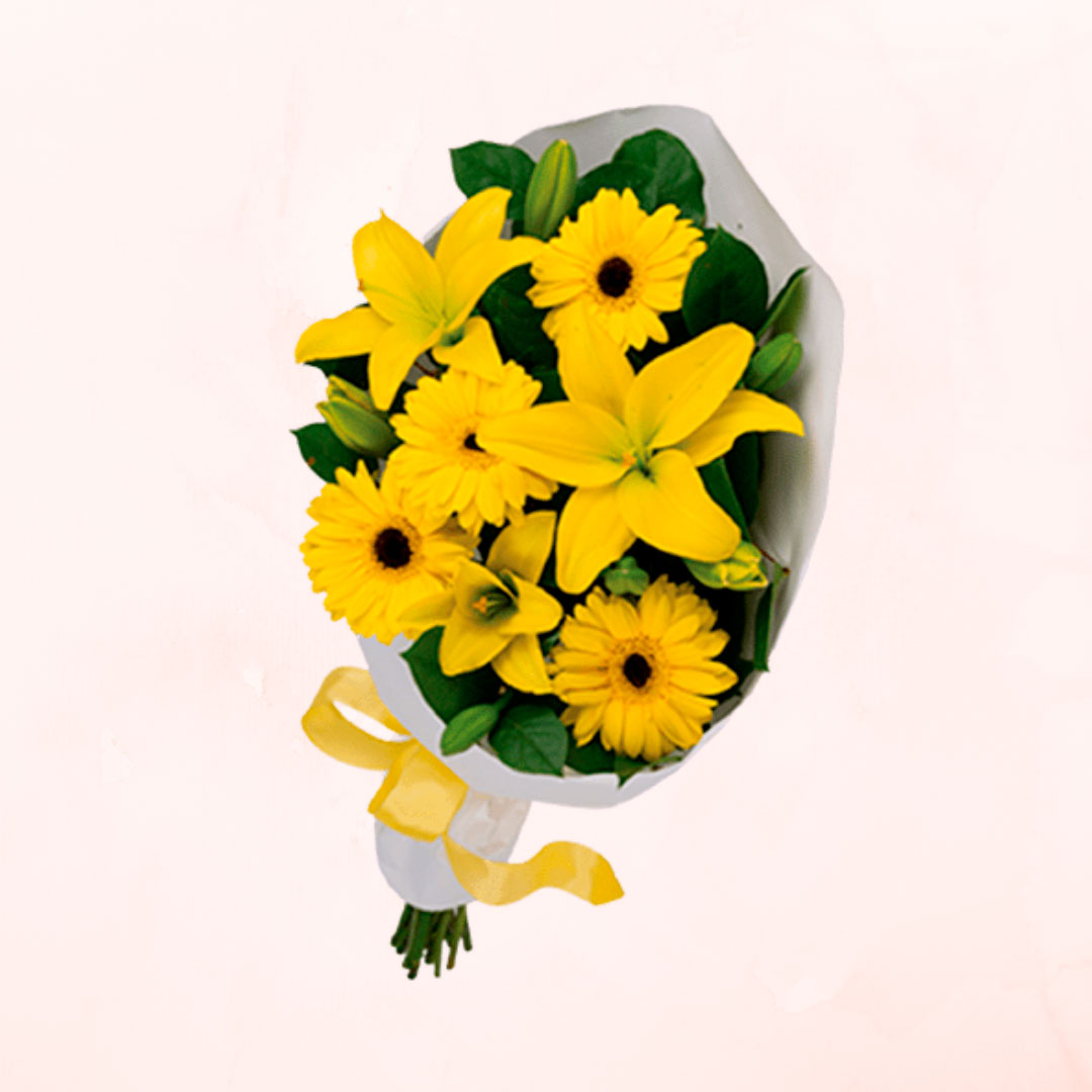 Ramo elegante que combina lilium amarillos de pétalos sedosos con gerberas vibrantes, creando una composición floral de gran impacto visual. Los lilium aportan sofisticación y fragancia delicada, mientras que las gerberas añaden volumen y energía con sus flores grandes y coloridas. Ideal para expresar alegría, gratitud o celebraciones especiales. Cada tallo es seleccionado cuidadosamente para garantizar frescura y durabilidad. Perfecto para decorar espacios o regalar en momentos significativos.