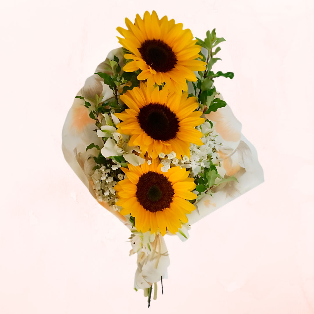 Ramo elegante compuesto por tres girasoles dispuestos en escala ascendente, creando una composición visual dinámica y sofisticada. Los girasoles, símbolos de alegría y vitalidad, se presentan en diferentes alturas para potenciar el impacto estético. Ideal para expresar admiración, celebrar momentos especiales o iluminar cualquier espacio con su calidez natural. Cada tallo es cuidadosamente seleccionado para garantizar frescura y durabilidad. Una opción versátil que combina simplicidad con distinción, perfecta para entregas a domicilio en Santiago.