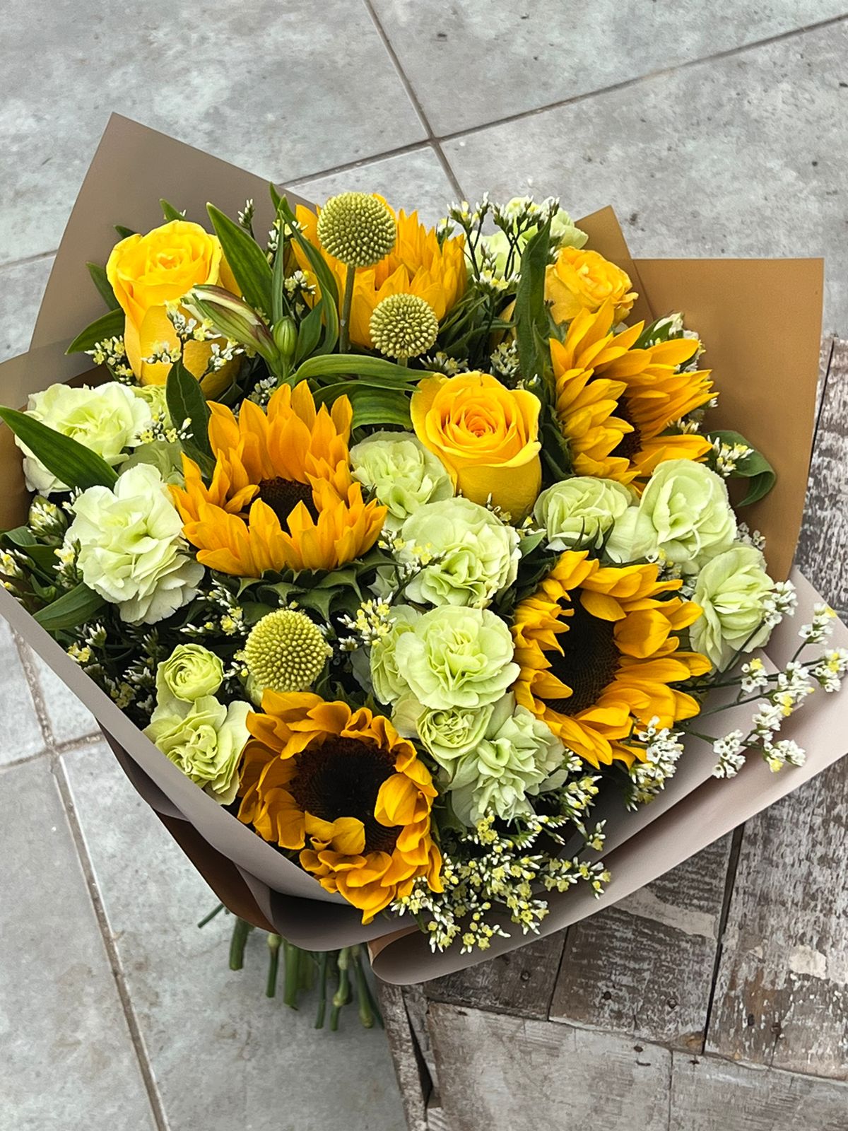 Ramón con girasoles, lisiantus y craspedia