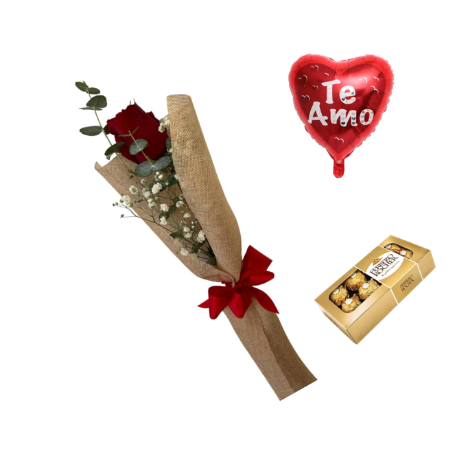 Rosa individual acompañada de chocolates Ferrero Rocher y un globito decorativo. Esta combinación clásica fusiona la elegancia de una rosa premium con detalles que realzan su presentación. Perfecta para expresar sentimientos en ocasiones especiales, cumpleaños o gestos de aprecio. Cada elemento ha sido seleccionado para garantizar una experiencia memorable. Disponible para entrega a domicilio en Santiago.